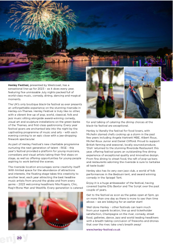 The UK’s only boutique black-tie festival as ever presents an unforgettable experience on the stunning riverside in Henley-on-Thames. Henley Festival is truly like no other, with a vibrant line-up of pop, world, classical, folk and jazz music sitting alongside award-winning comedy, visual art and sculpture installations on the green banks of the Thames, and first-class gastronomy. Every year festival goers are enchanted late into the night by the captivating programme of music and arts – with each evening coming to an epic close with a jaw-dropping firework spectacular.