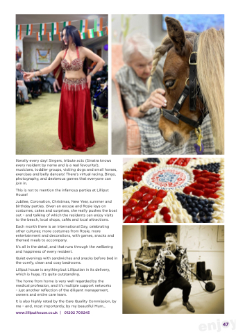 Jubilee, Coronation, Christmas, New Year, summer and birthday parties. Given an excuse and Rosie lays on costumes, cakes and surprises, she really pushes the boat out – and talking of which the residents can enjoy visits to the beach, local shops, cafés and local attractions.