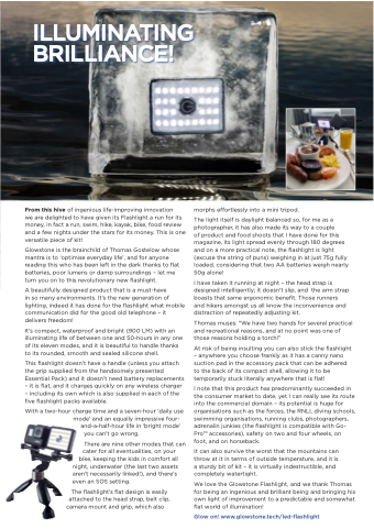 Glowstone is the brainchild of Thomas Gostelow whose mantra is to ‘optimise everyday life’, and for anyone reading this who has been left in the dark thanks to flat batteries, poor lumens or damp surroundings – let me turn you on to this revolutionary new flashlight.